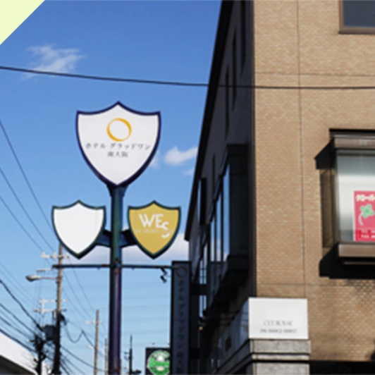 右に曲がる信号の交差点には、「ホテルググラッドワン南大阪」があります。